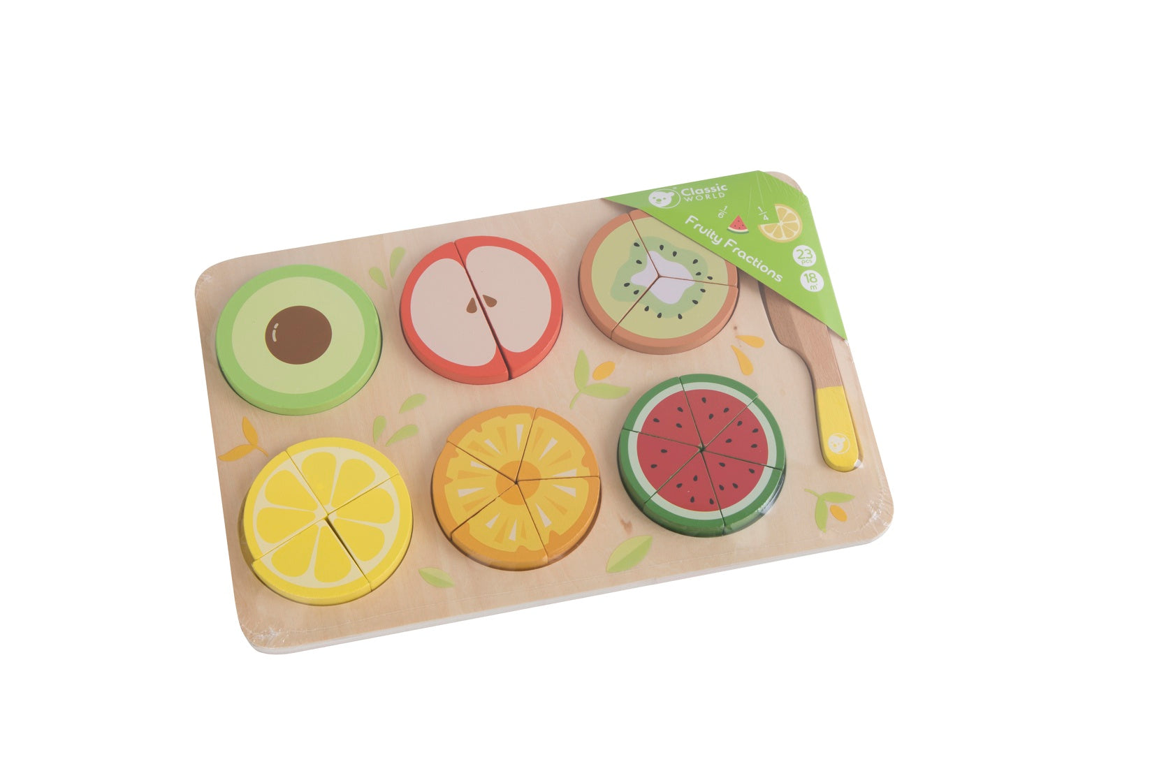 Fracciones de Frutas incluye 6 frutas coloridas como manzana, kiwi, limón y más. Se cortan por la mitad o por un tercio o más. Los niños pueden aprender fracciones matemáticas mientras juegan a cortar frutas.