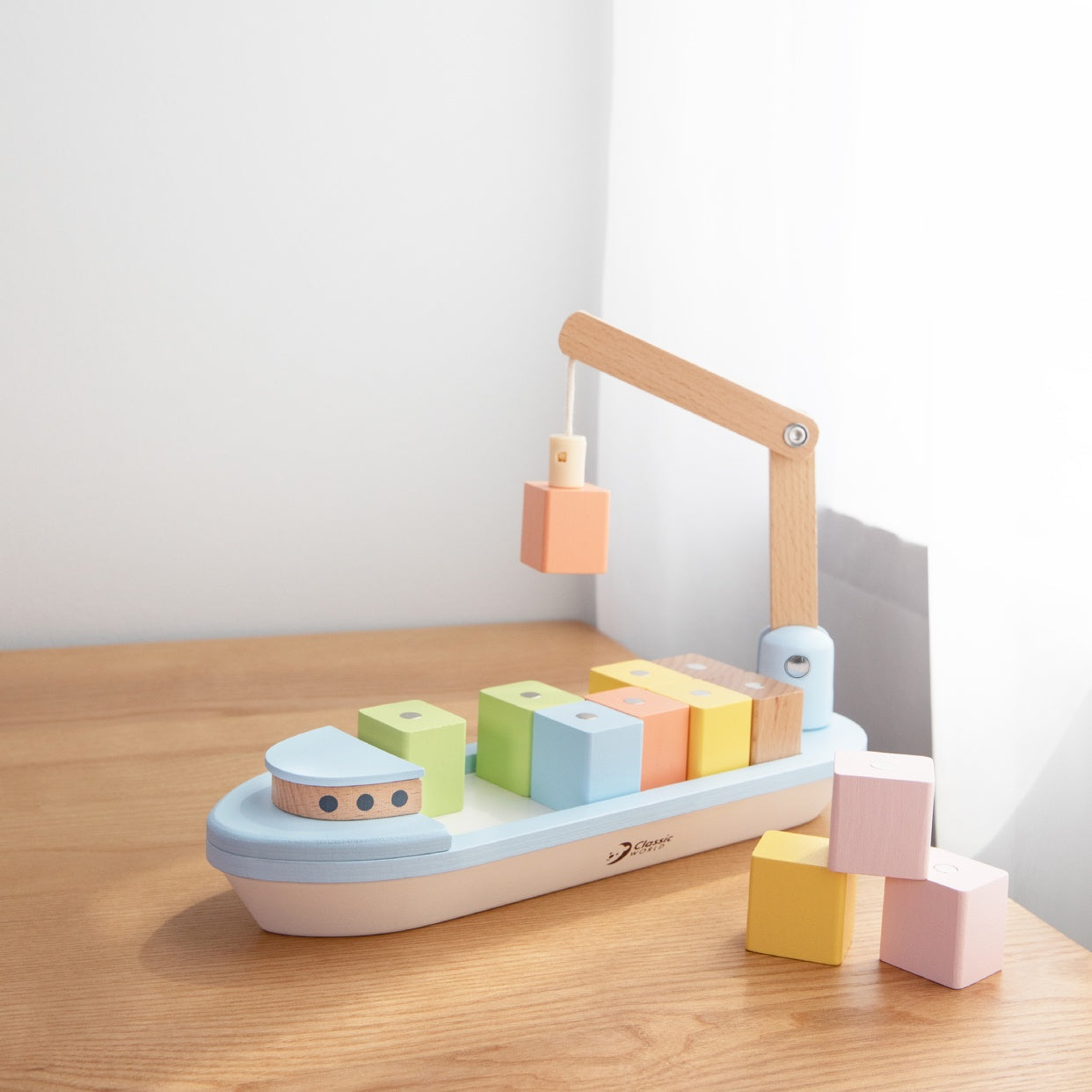 Este es un pequeño y divertido barco de carga cargado de hermosas mercancías. El barco tiene 12 bloques magnéticos de colores y los niños pueden cargar y descargar transfiriendo mercancías, moviendo la torre de perforación flexible. Pueden aprender estructuras físicas, además de mejorar su motricidad fina.