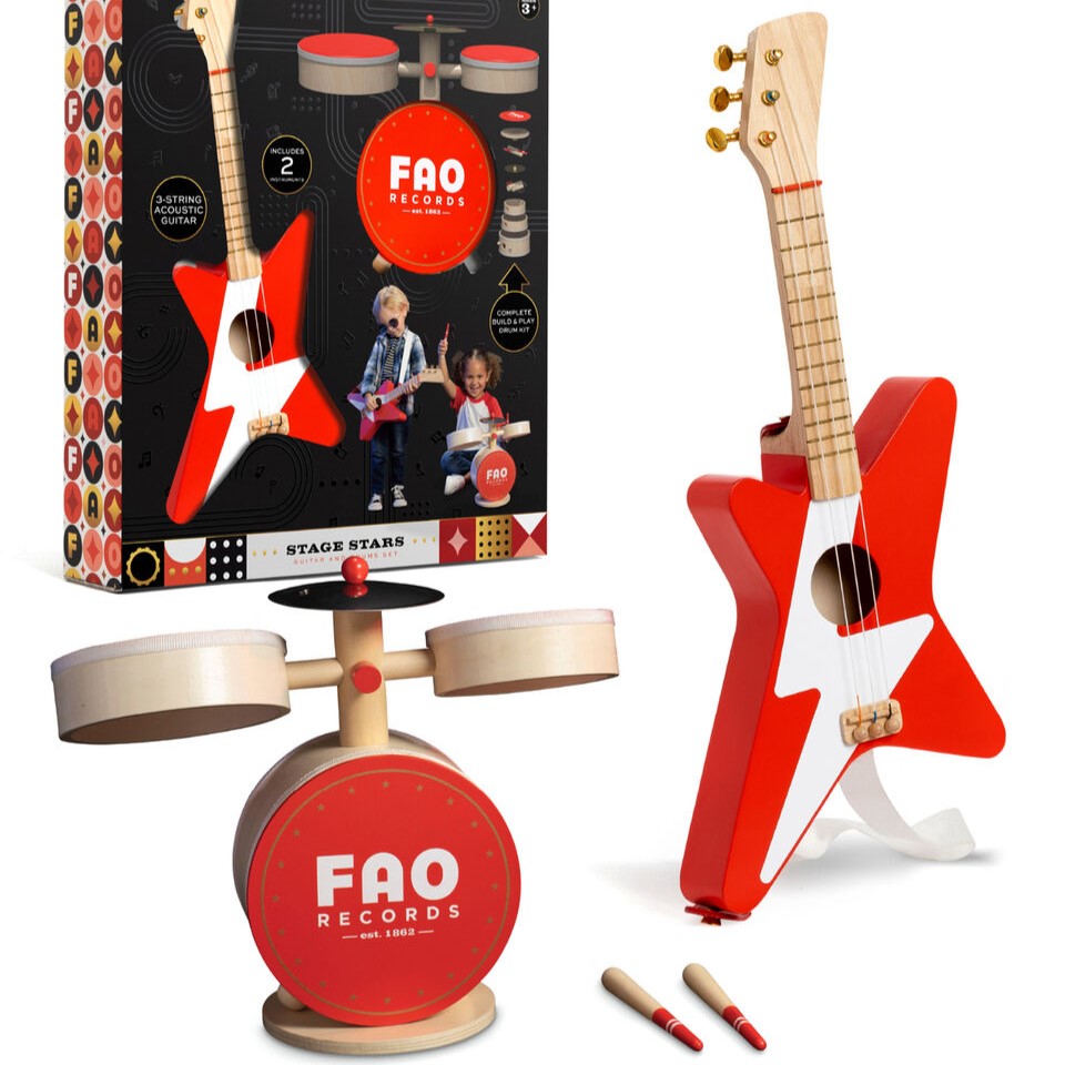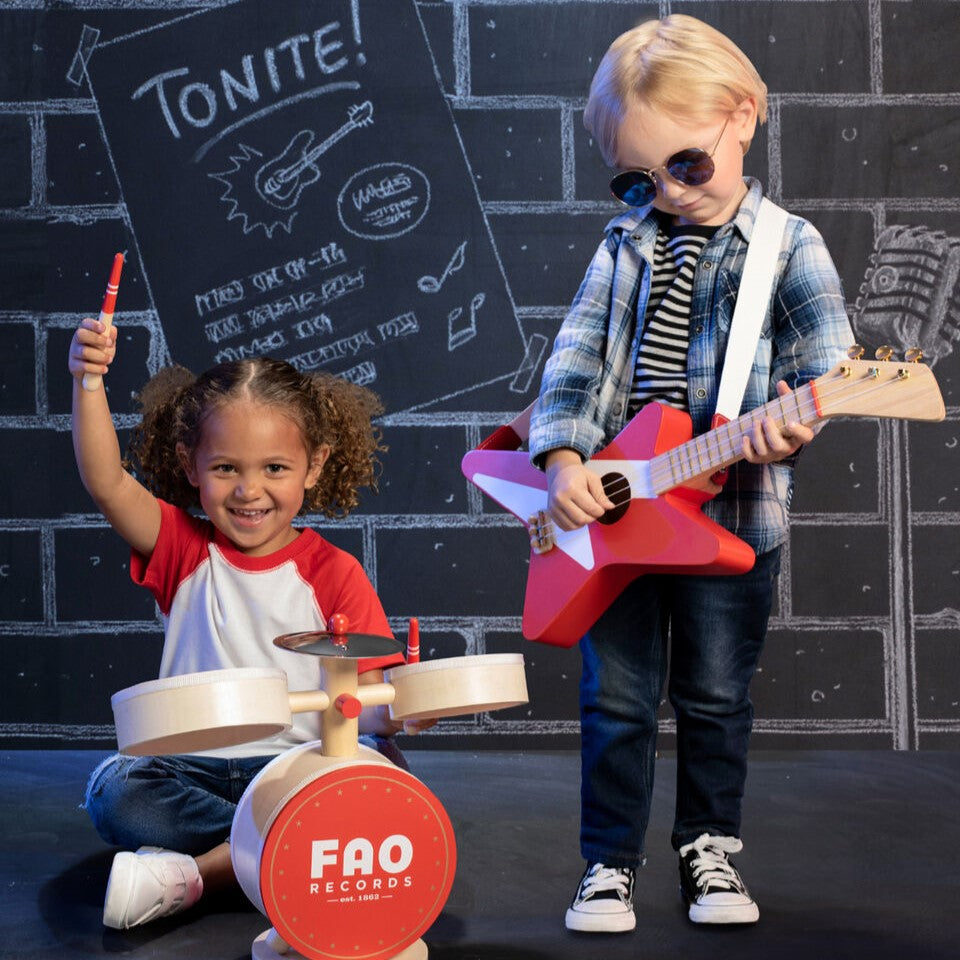 FAO Schwarz ha estado trayendo la magia del juego y la imaginación a niños (¡y a los jóvenes de corazón!) durante generaciones. Este set de guitarra y batería de madera seguramente inspirará el amor por la música y el espectáculo.