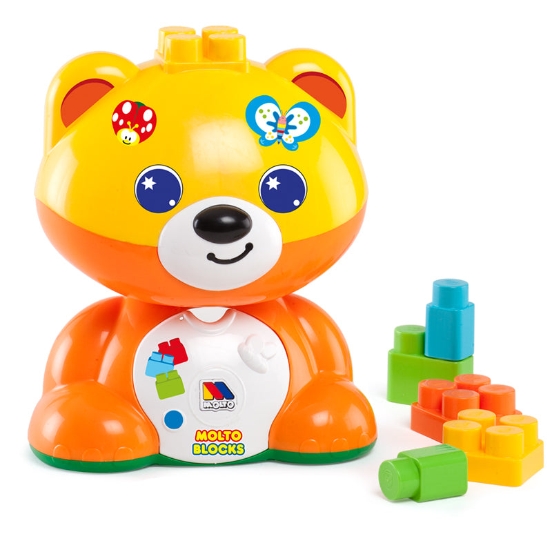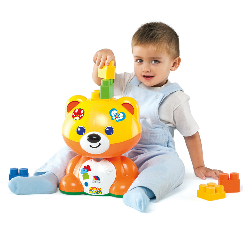 Con el Oso Bloques los niños aprenden conceptos sencillos, asimilan los colores y diferencian tamaños, formas y equivalencias. También desarrollan su imaginación creando formas libremente. Los bloques de Molto son resistentes, seguros y grandes para una fácil manipulación.