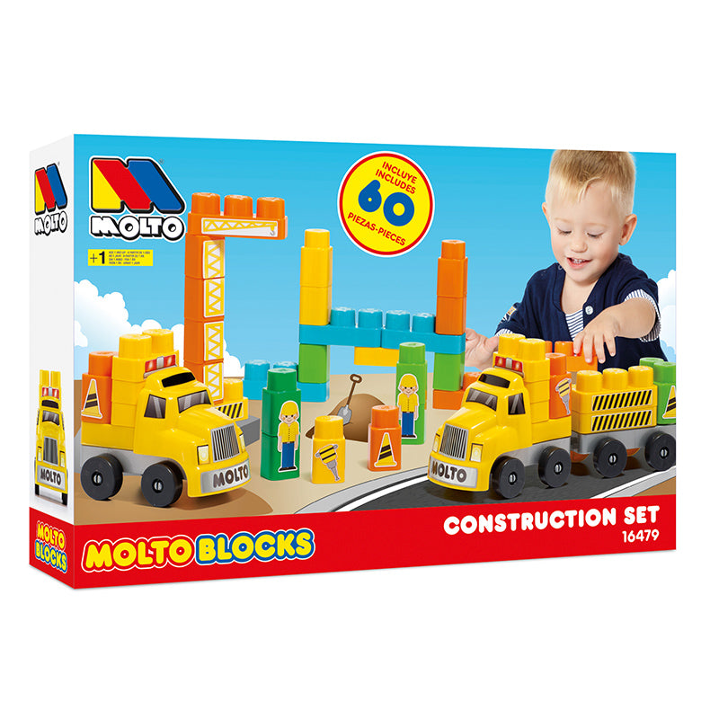 Nuevo juego de bloques de construcción de Molto. Con 60 piezas de distintas formas y colores, los fantásticos camiones de construcción que tu peque podrá construir maravillas y aprender y desarrollar una habilidad manual y una imaginación muy buena.