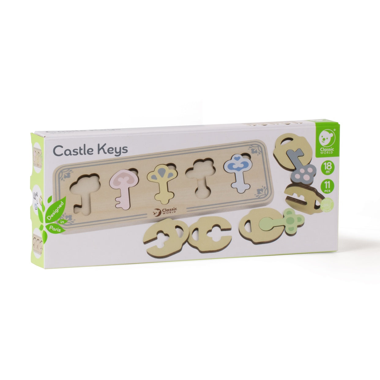 Este es un divertido juego de combinación que recuerda a un antiguo castillo misterioso. Cinco llaves con formas únicas se adaptan a sus propias cerraduras. Los niños necesitan encontrar la cerradura correspondiente para abrir la "puerta antigua". Excelente para la coordinación mano-ojo y la cognición gráfica de los niños pequeños.