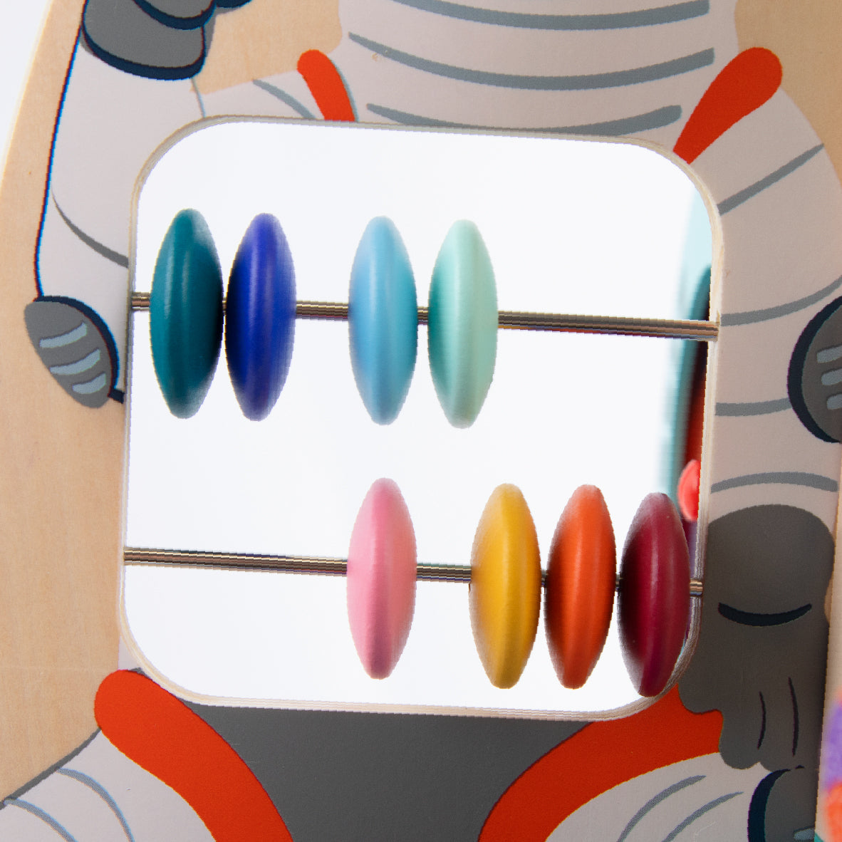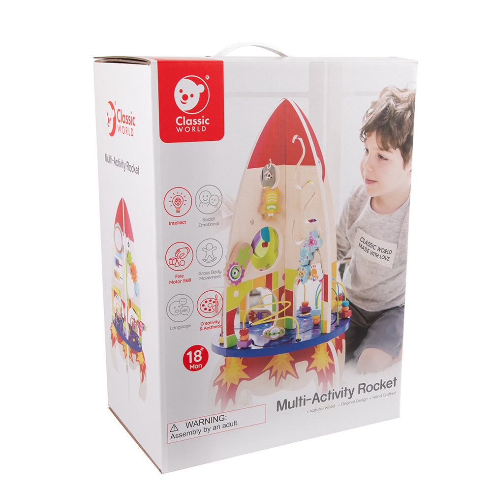 ¡Este cohete multi-interactivo es una fabulosa estación de aprendizaje educativo! Incluye: laberinto de cuentas, juego de engranajes, relojes y un espejito. Los niños se sentirán inspirados a usar su imaginación y desarrollar juegos de roles.