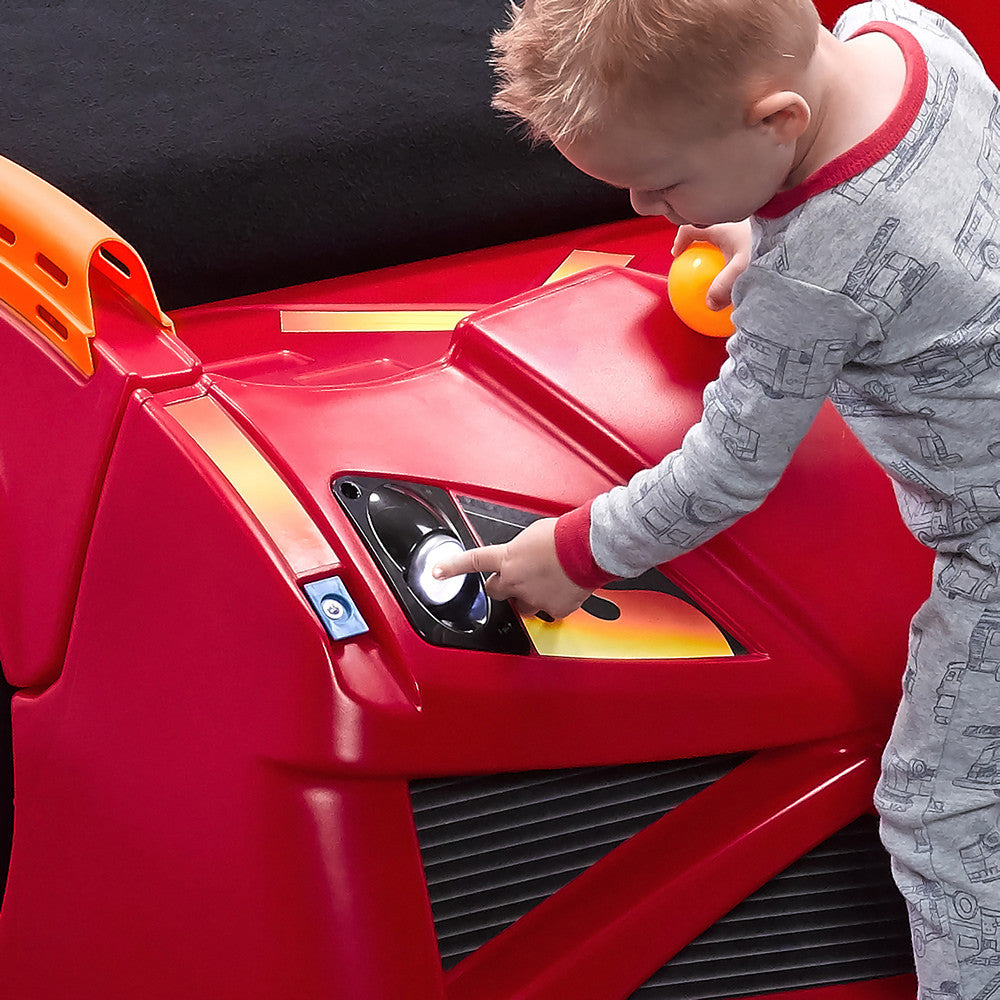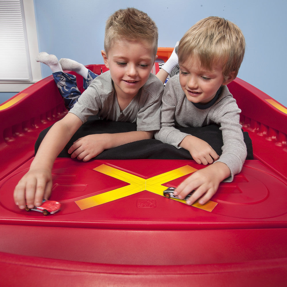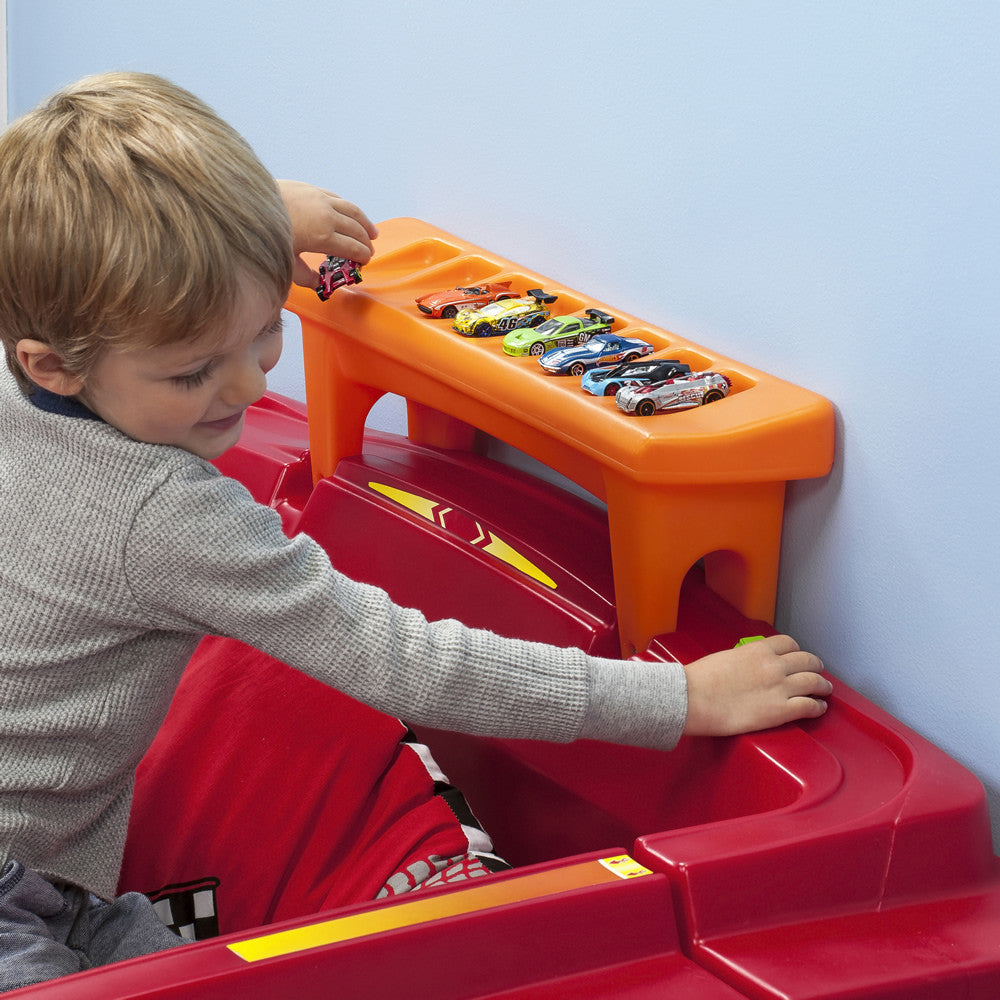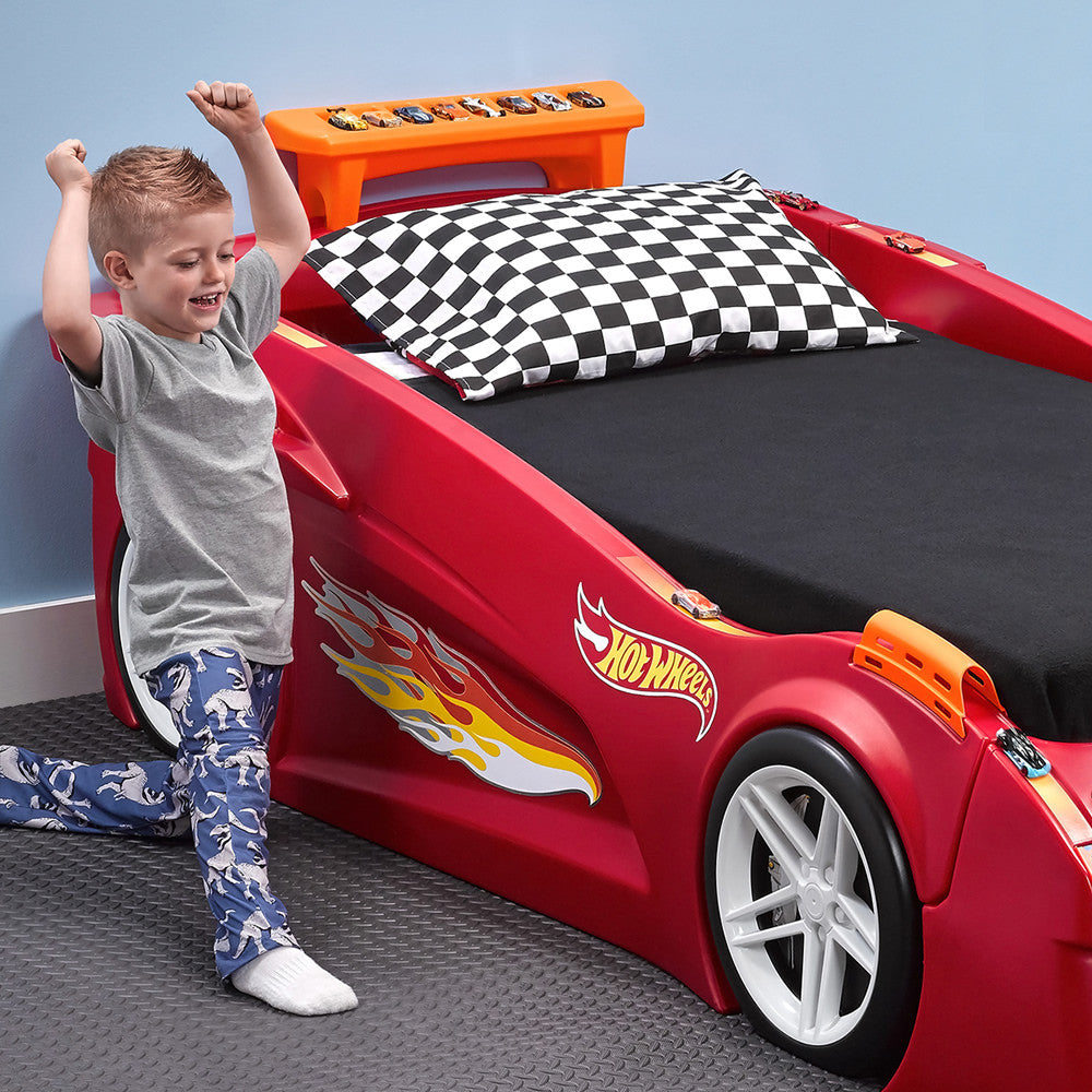 Los pequeños fans de las carreras soñarán a 100 kilómetros por hora en la Cama de Auto Carreras Hot Wheels™de Step2. Los entusiastas automovilísticos amarán mostrar su colección de Hot Wheels™ en los respiraderos y el alerón. Esta cama de juguete para niños hará más fácil y divertida la transición desde la cuna. Crece con tu pequeño y se transforma en una cama individual. ¡Acelera hacia la tierra de los sueños por años por venir con esta cama de Hot Wheels™! Hecha en EUA de partes de EEUU e importadas de China.