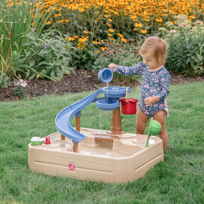 Los niños y los bebés pueden chapotear y jugar todo el día con el Naturally Playful® Splashway Canal™. Con juego de agua al nivel del suelo, este producto proporciona fácil acceso para los más pequeños de todas las edades para sentarse o pararse mientras juegan. Los niños pueden verter agua en la bandeja superior y observar cómo se mueve hacia la bandeja inferior de la ducha de lluvia y luego bajar por el tobogán, ¡proporcionando un impulso emocionante a los barcos que se deslizan! Pequeñas manos pueden llevar los barcos con ruedas alrededor de la pista moldeada y cruzar el puente levadizo empapándolo con la lluvia que cae desde arriba. ¡Es un juguete acuático para niños lo suficientemente grande para que jueguen, aprendan y descubran juntos varios niños! Fabricado en EE.UU. con piezas tanto estadounidenses como importadas.