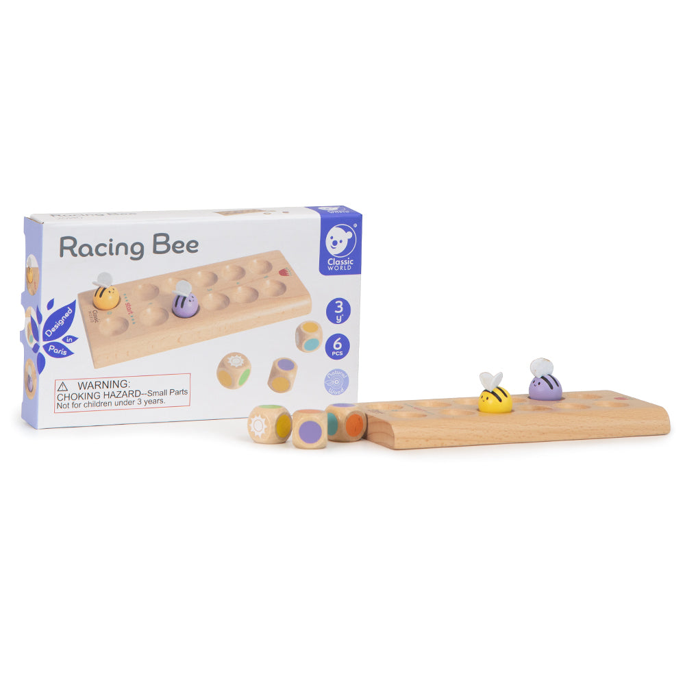 ¡Juguemos al juego de carreras! Los niños usan el patrón de los dados para decidir si las abejas avanzan o retroceden y comparan quién llega primero al final.