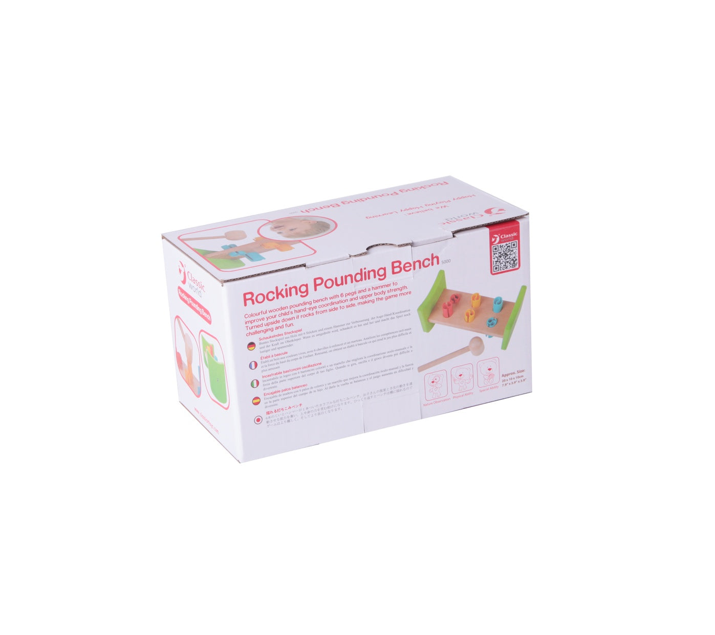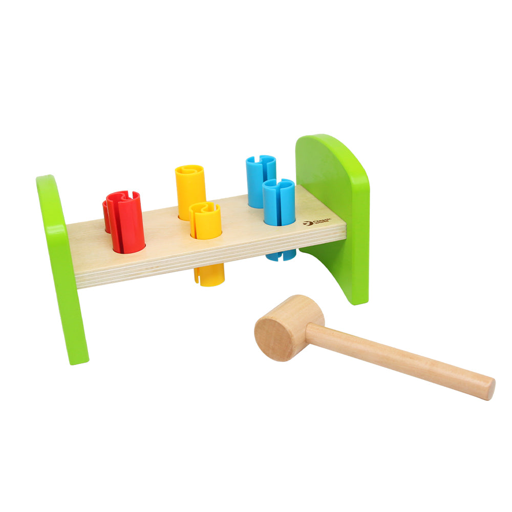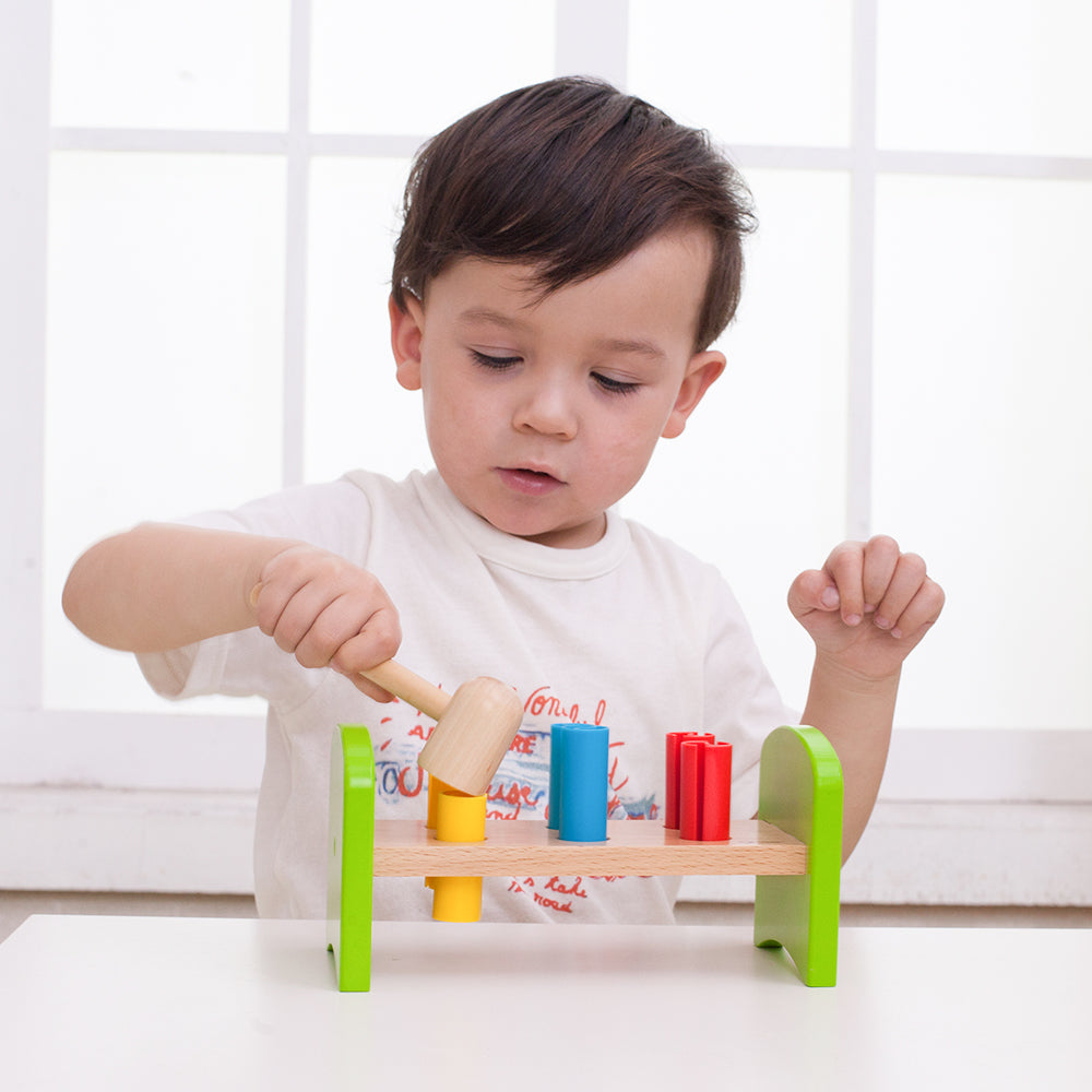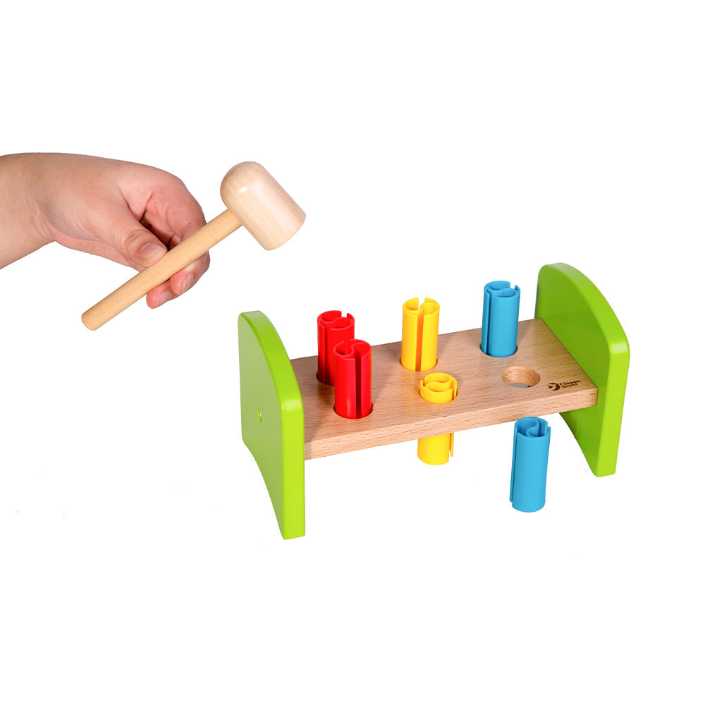 Colorido banco de madera para golpear con 6 clavijas y un martillo que desarrollará la coordinación ojo-mano y la fuerza de los brazos de los pequeños. Se balancea de lado a lado al darle la vuelta, lo que hace que el juego sea más desafiante y divertido.