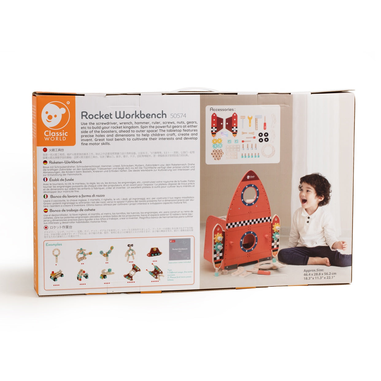Utilice el destornillador, la llave inglesa, el martillo, la regla, los tornillos, las tuercas, los engranajes y más para construir su reino de cohetes. ¡Gira los potentes engranajes a ambos lados de los propulsores, hacia el espacio exterior! El tablero presenta orificios y dimensiones precisos para ayudar a los niños a hacer manualidades, crear e inventar. Gran banco de herramientas para cultivar sus intereses y desarrollar la motricidad fina. El set incluye 51 piezas.