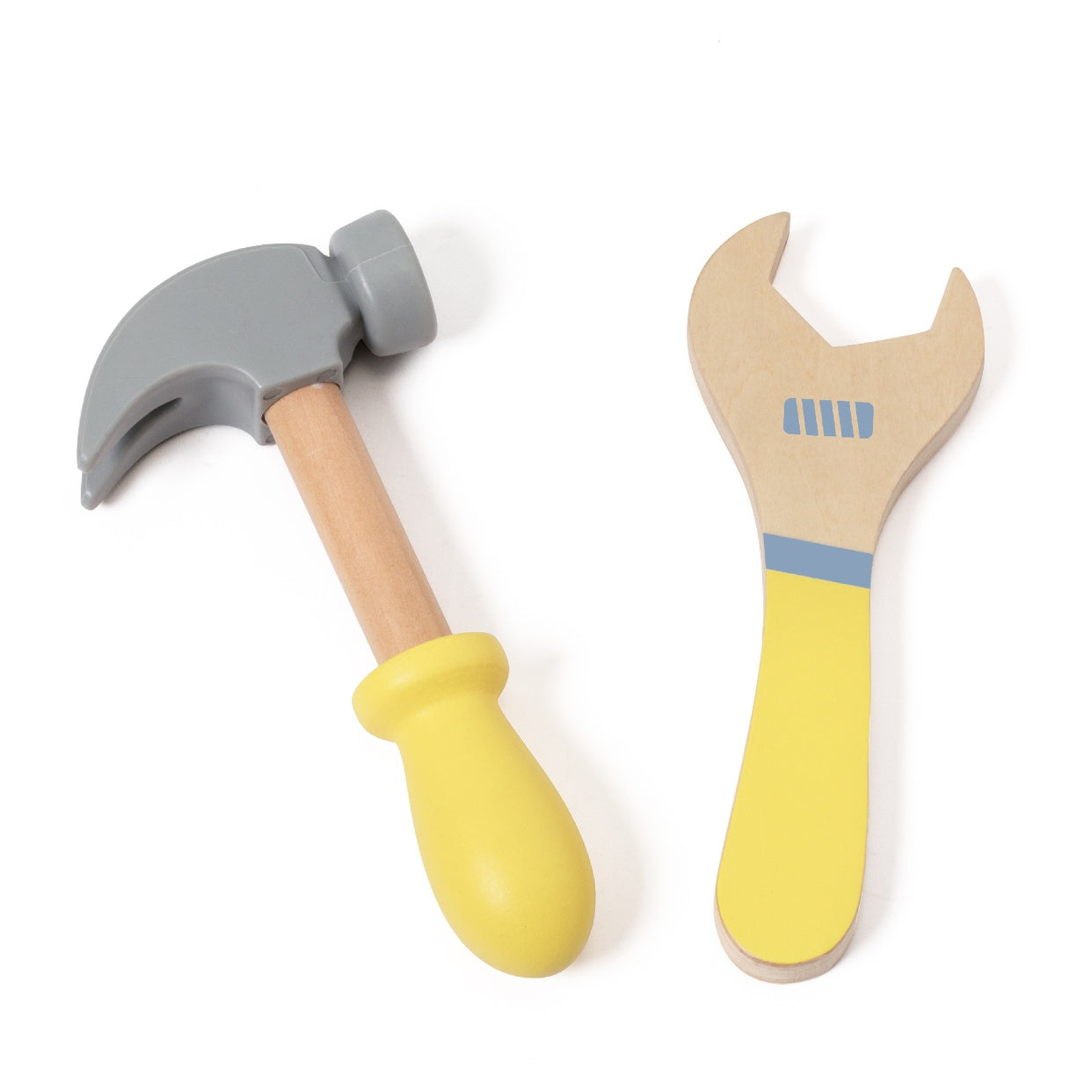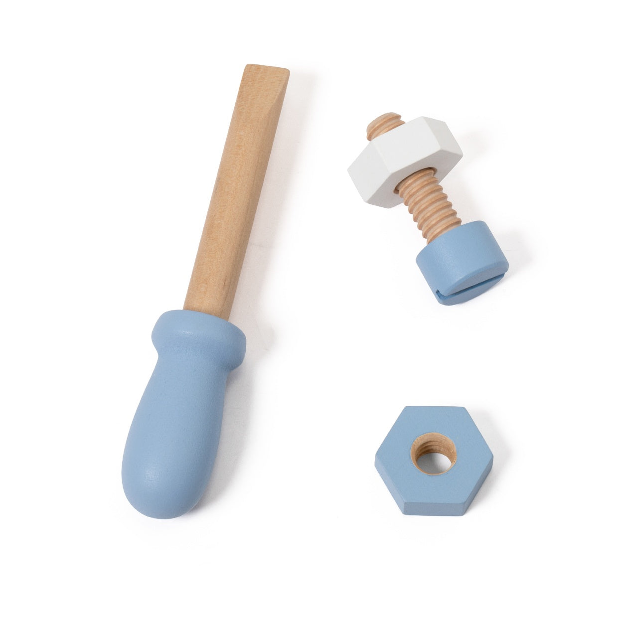 Es un cinturón de herramientas que contiene herramientas y accesorios de carpintería. Los niños pueden atarlo a la cintura, correr y saltar. Aprenderán a atornillar y clavar, y potenciarán su creatividad y su motricidad fina.