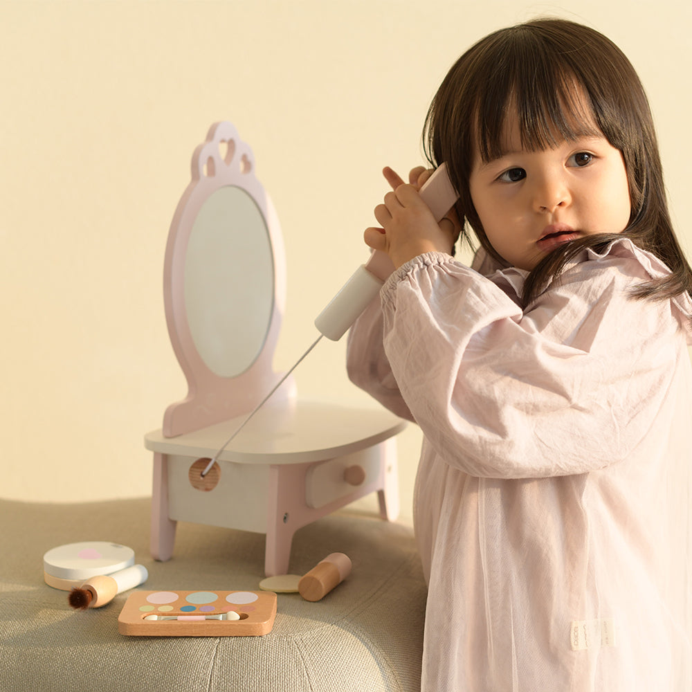 Toda niña quiere su propio Tocador de Vanidad Rosa. Esta cómoda incluye peine, lápiz labial, plancha para el cabello, pulsera, anillo, brocha de maquillaje y borla para polvo.
