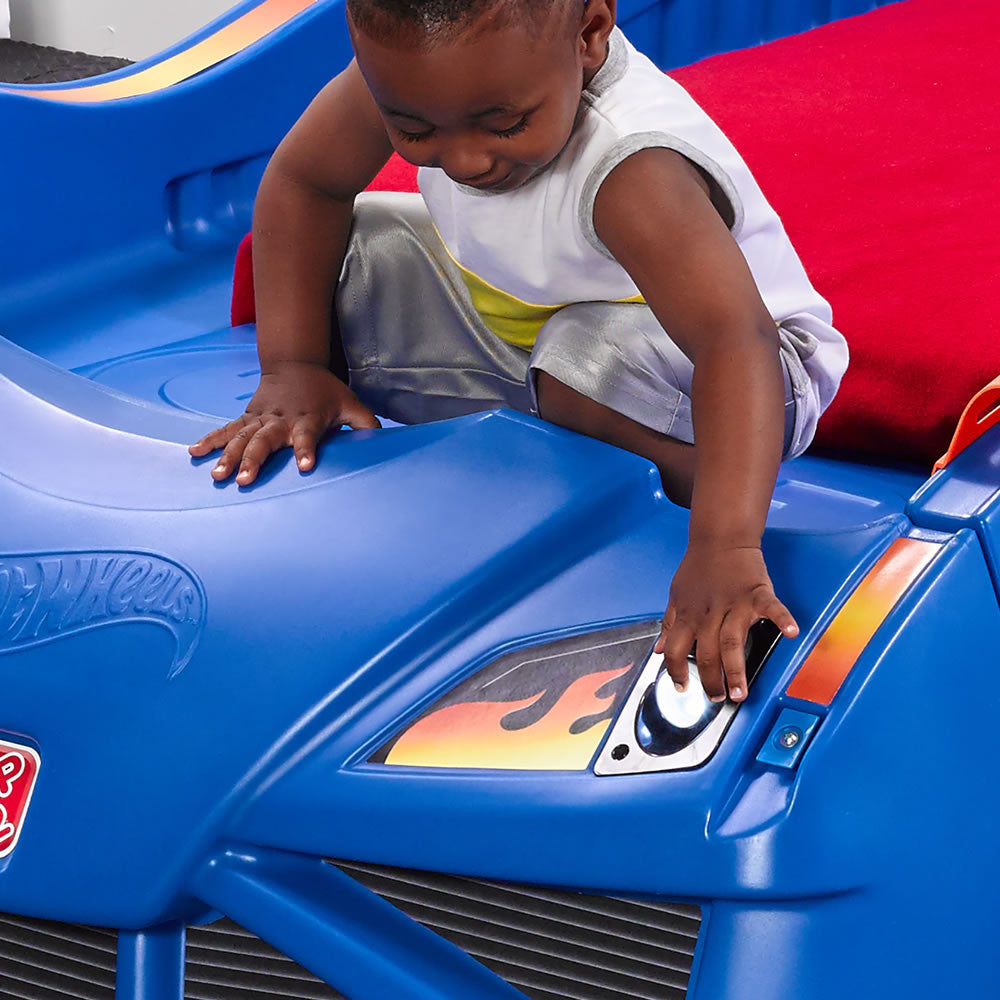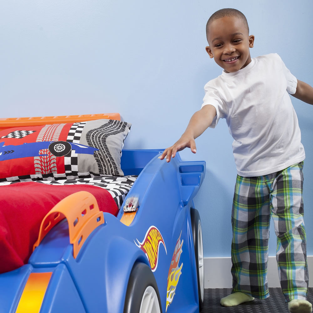 Los pequeños fans de las carreras soñarán a 100 kilómetros por hora en la Cama de Auto de Carreras Hot Wheels de Step2. Los entusiastas automovilísticos amarán mostrar su colección de Hot Wheels en los respiraderos y el alerón. Esta cama de juguete para niños hará más fácil y divertida la transición desde la cuna. Crece con tu peque̱o y se transforma en una cama individual. Acelera hacia la tierra de los sueños por años por venir con esta cama de Hot Wheels! Hecha en EUA de partes de EEUU e importadas de China.