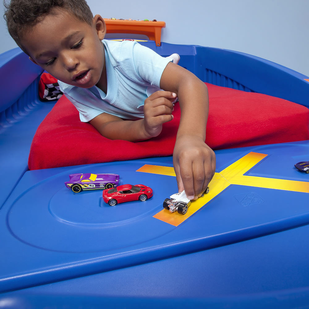 - Pistas de carreras moldeadas a los lados de la cama y más pistas de Hot Wheels pueden añadirse para una carrera más larga