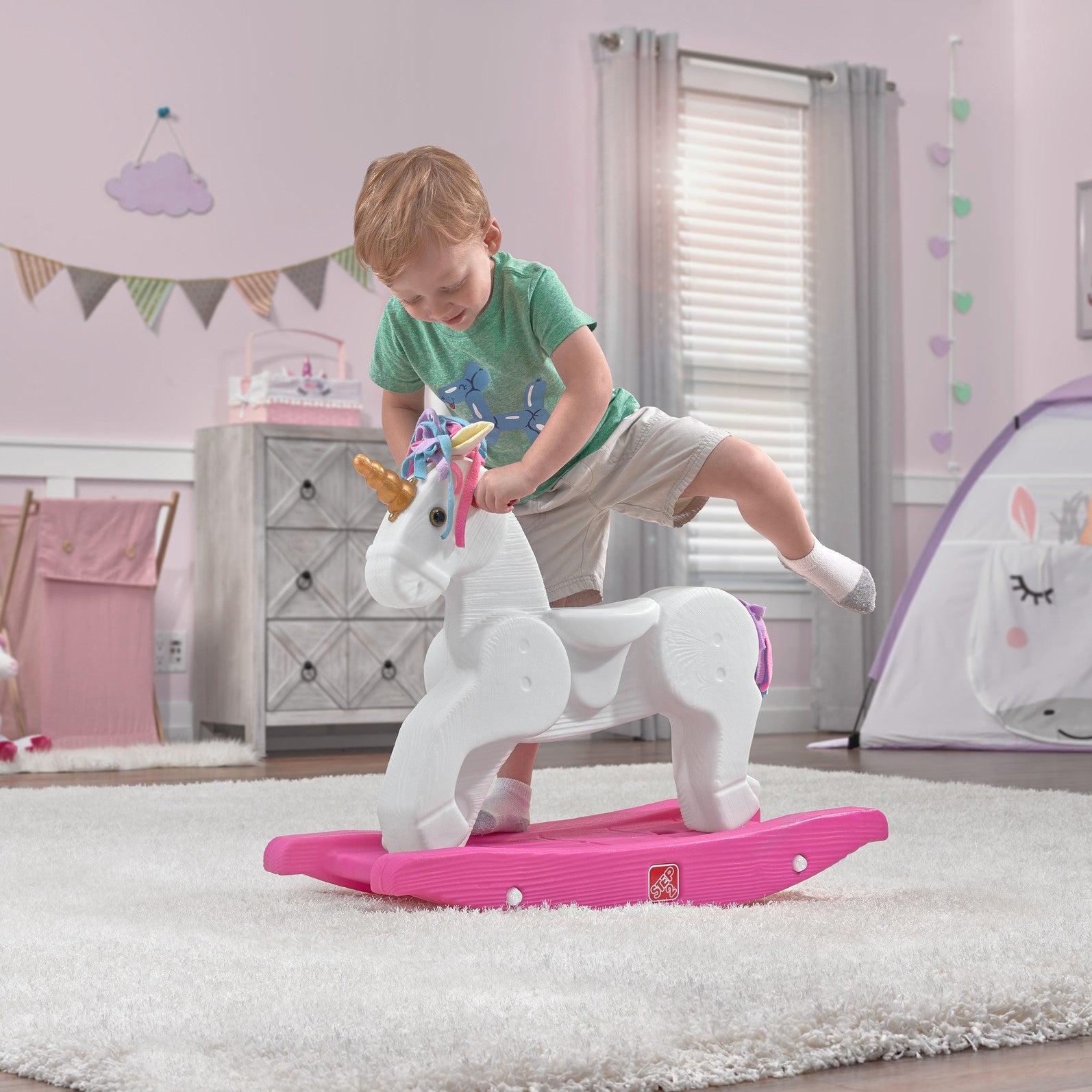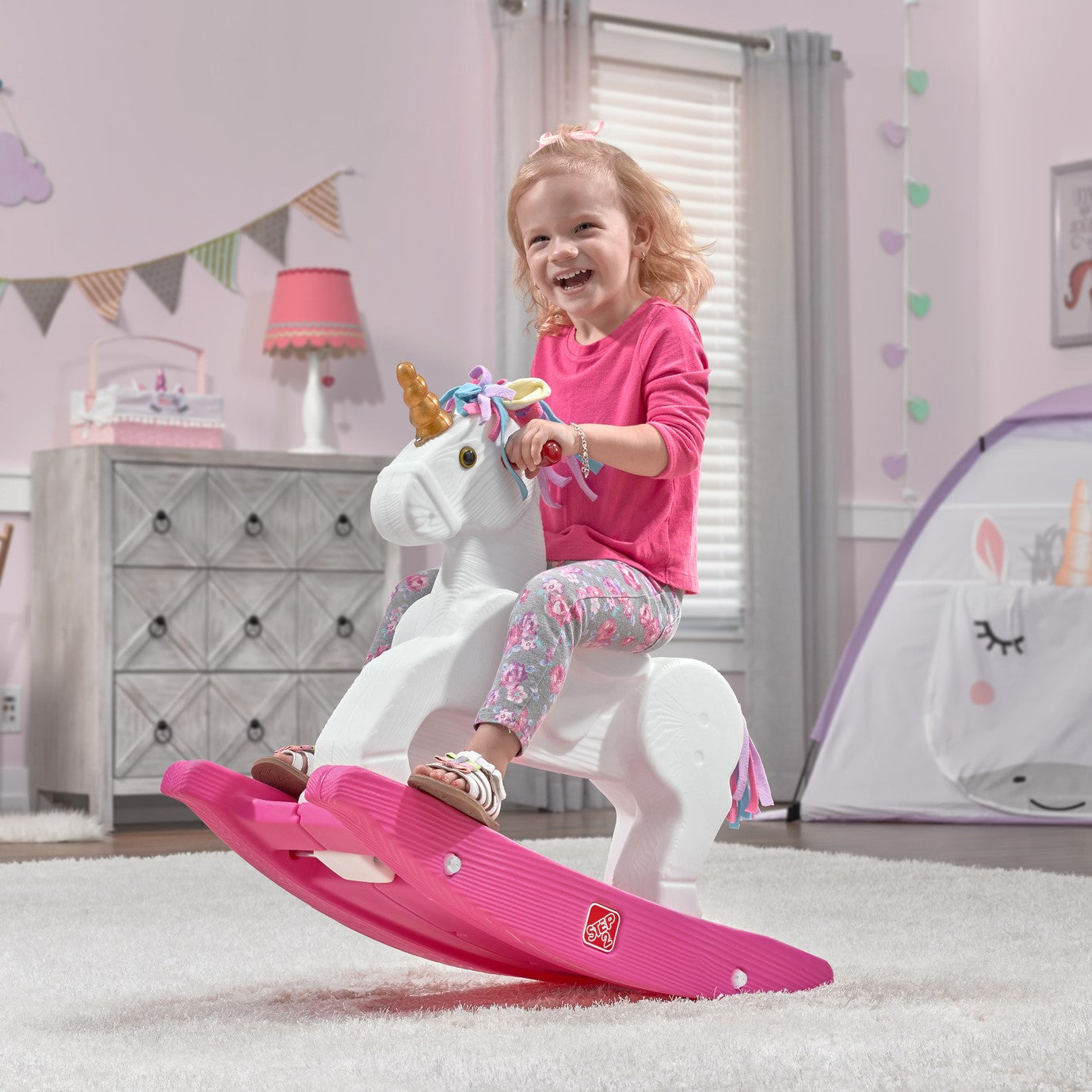 Desde la suave melena y la cola de color pastel hasta el cuerno "dorado" y los sonidos mágicos, ¡este es un adorable unicornio listo para aventuras místicas con tu pequeño! El estilo clásico incluye un asiento contorneado, manijas de fácil agarre y una base rosa resistente: algunos toques mágicos al diseño tradicional del caballo mecedora, lo que garantiza un viaje seguro para cada aventura de unicornio. Hecho en los EE. UU. Con piezas importadas y estadounidenses.