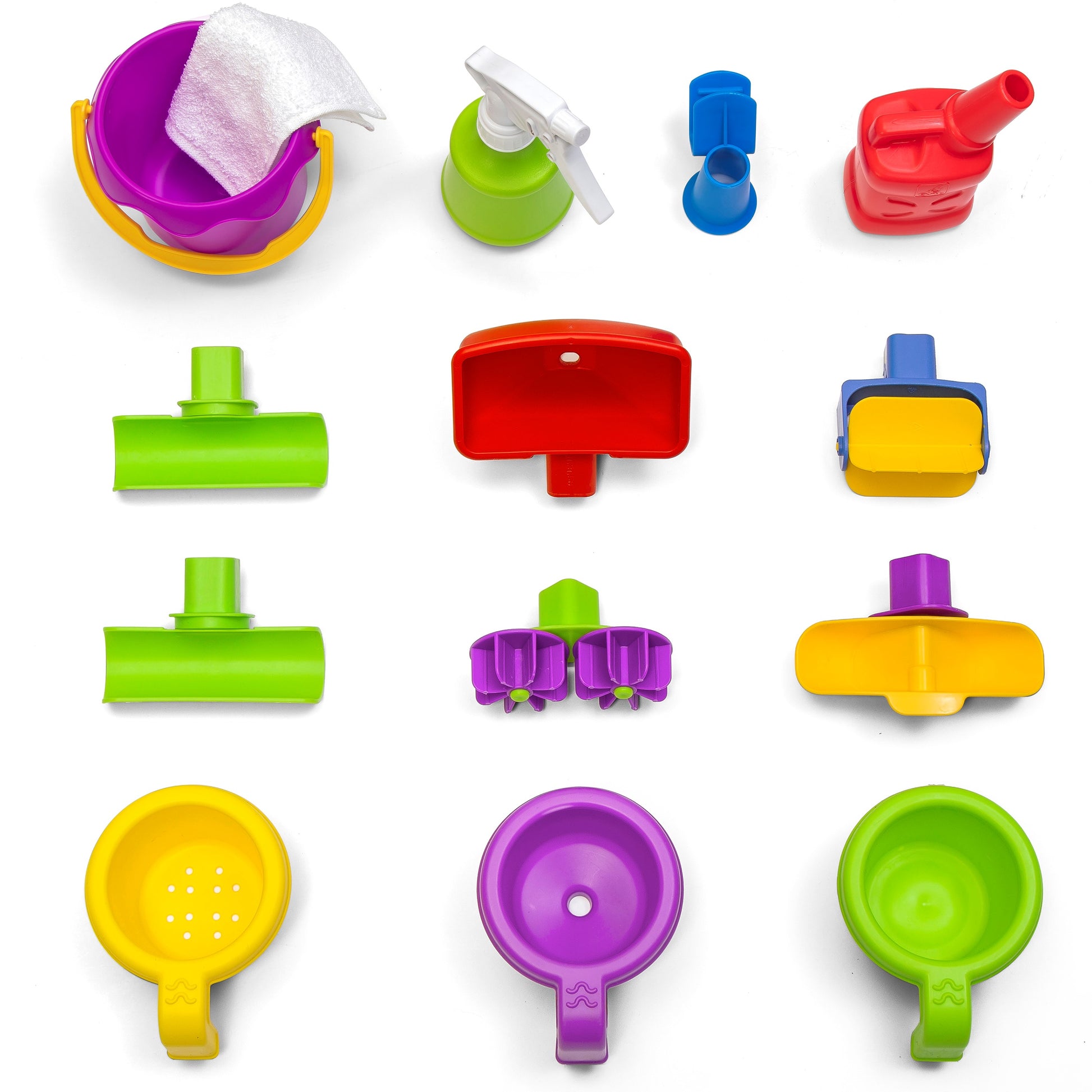 - En la caja: base de lavado de autos con bandeja superior de doble cara, juego de accesorios de 13 piezas que incluye piezas de laberinto para colocar y acomodar, lata de gas simulada, botella de spray con un trapo, ¡y más!