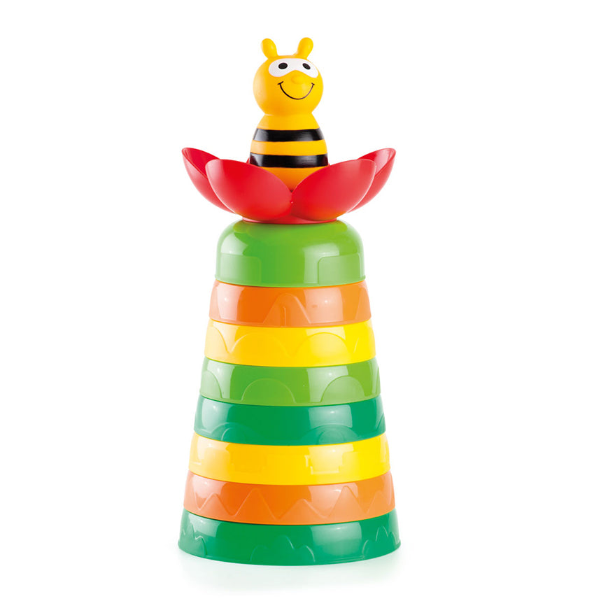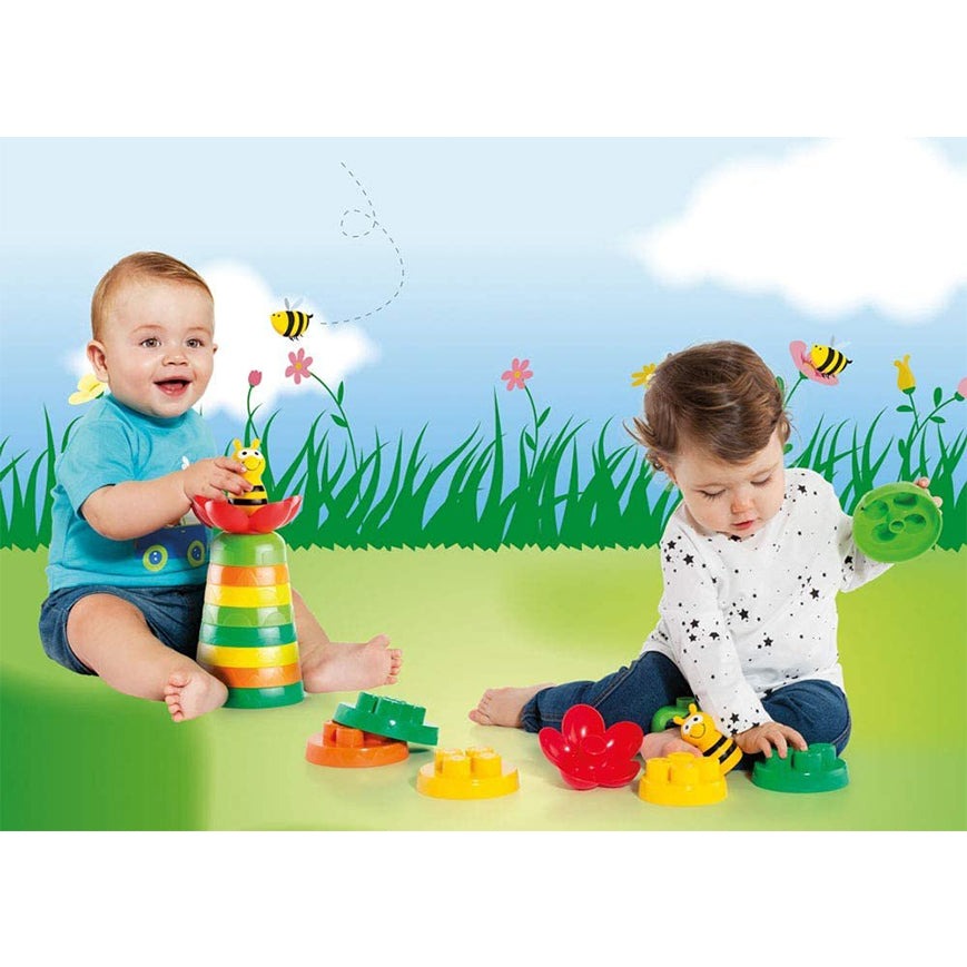 Flor de bloques con 10 piezas para montar una flor de muchos colores y una divertida abejita de juguete que corona la flor.