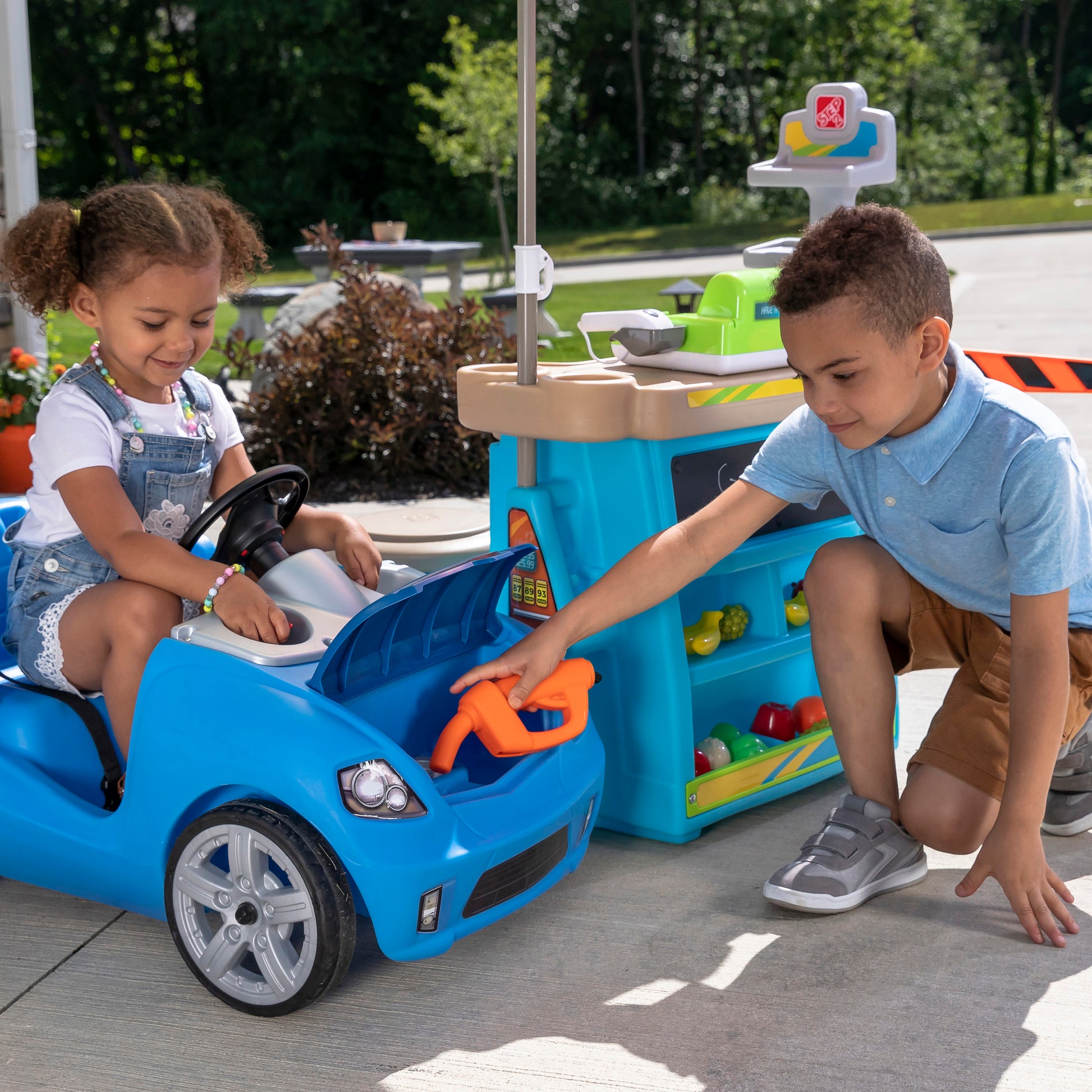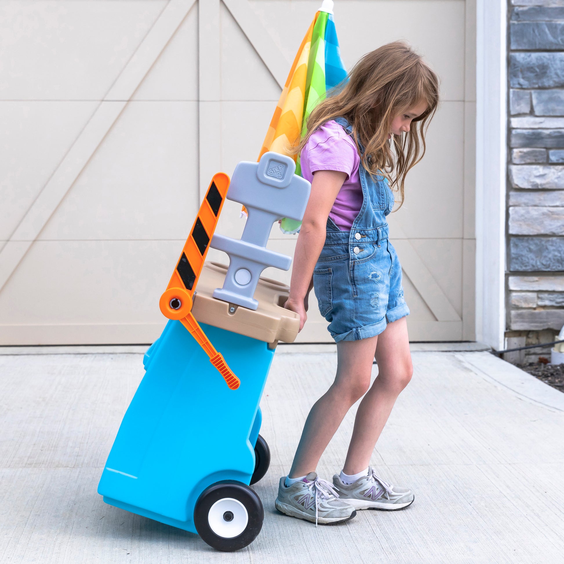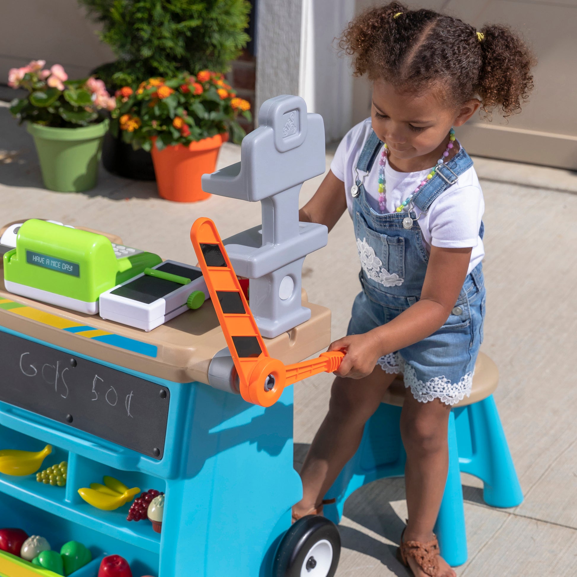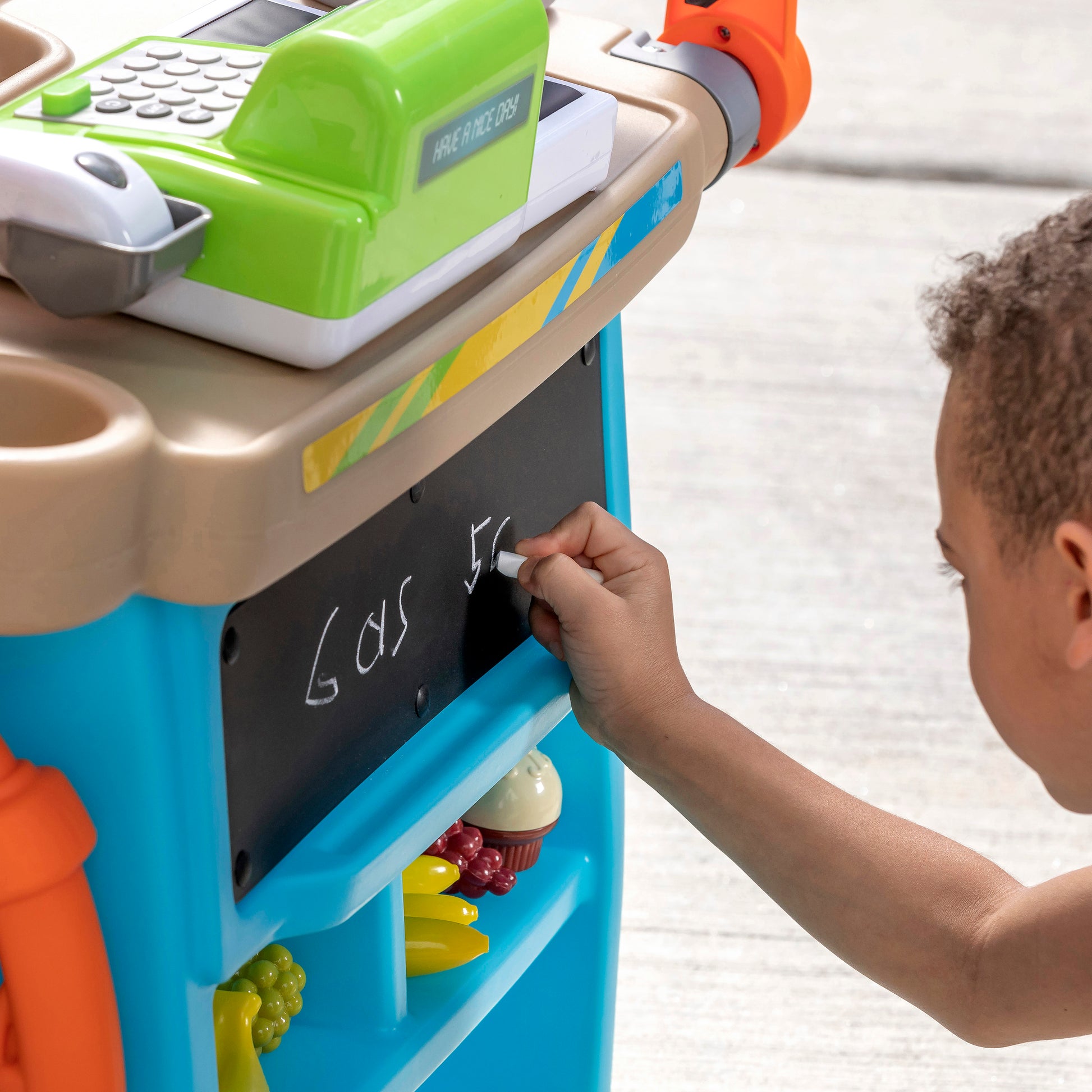 Pequeños emprendedores, prepárense; ¡predecimos mucha diversión y aprendizaje! ¡El Mercado Stop & Go de Step2 lo tiene todo! Este mercado de juguete viene con una bomba de gasolina, una cabina de peaje, conos, una pizarra y una caja registradora que funciona. Los niños pueden turnarse para jugar como cajero y cliente. Los pequeños pueden llegar al mercado en sus bicicletas o autos de juguete para llenar el tanque de gasolina y pagar el peaje. Incluso pueden usar la pizarra para escribir las ofertas diarias, los precios de la gasolina o el nombre de su mercado. Este mercado de juguete tiene una sombrilla para mantener a los niños protegidos y frescos del sol, y también tiene ruedas, para que puedan moverlo fácilmente a su próxima ubicación.